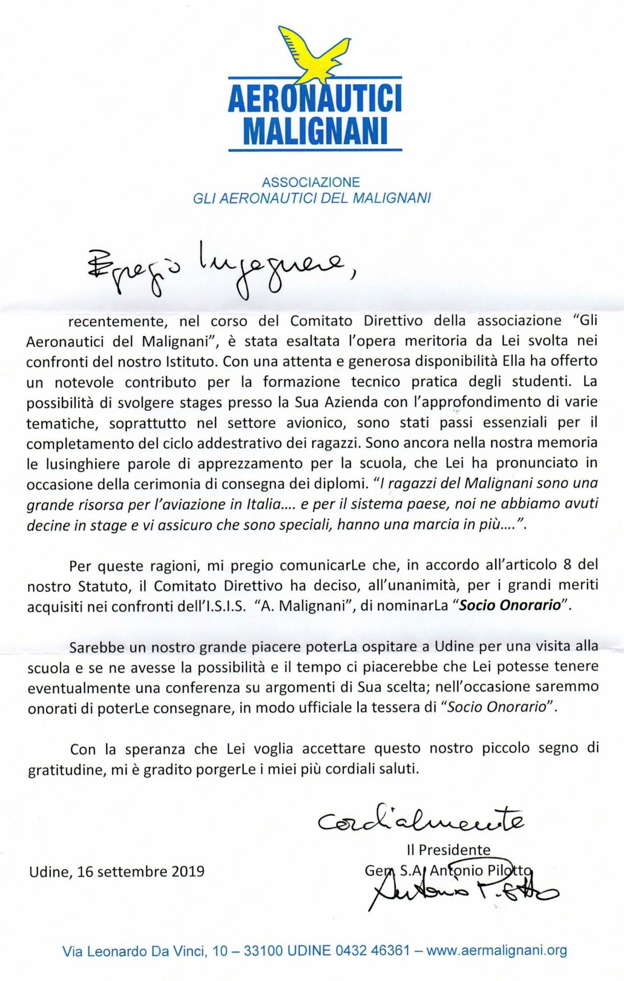 Come spesso accade, anche lo statuto de “Gli Aeronautici del Malignani” comtempla la possibilità di esprimere, attraverso la nomina a “socio onorario”, la propria soddisfazione e riconoscenza verso persone che si siano distinte in attività sinergiche ai fini dell’associazione.