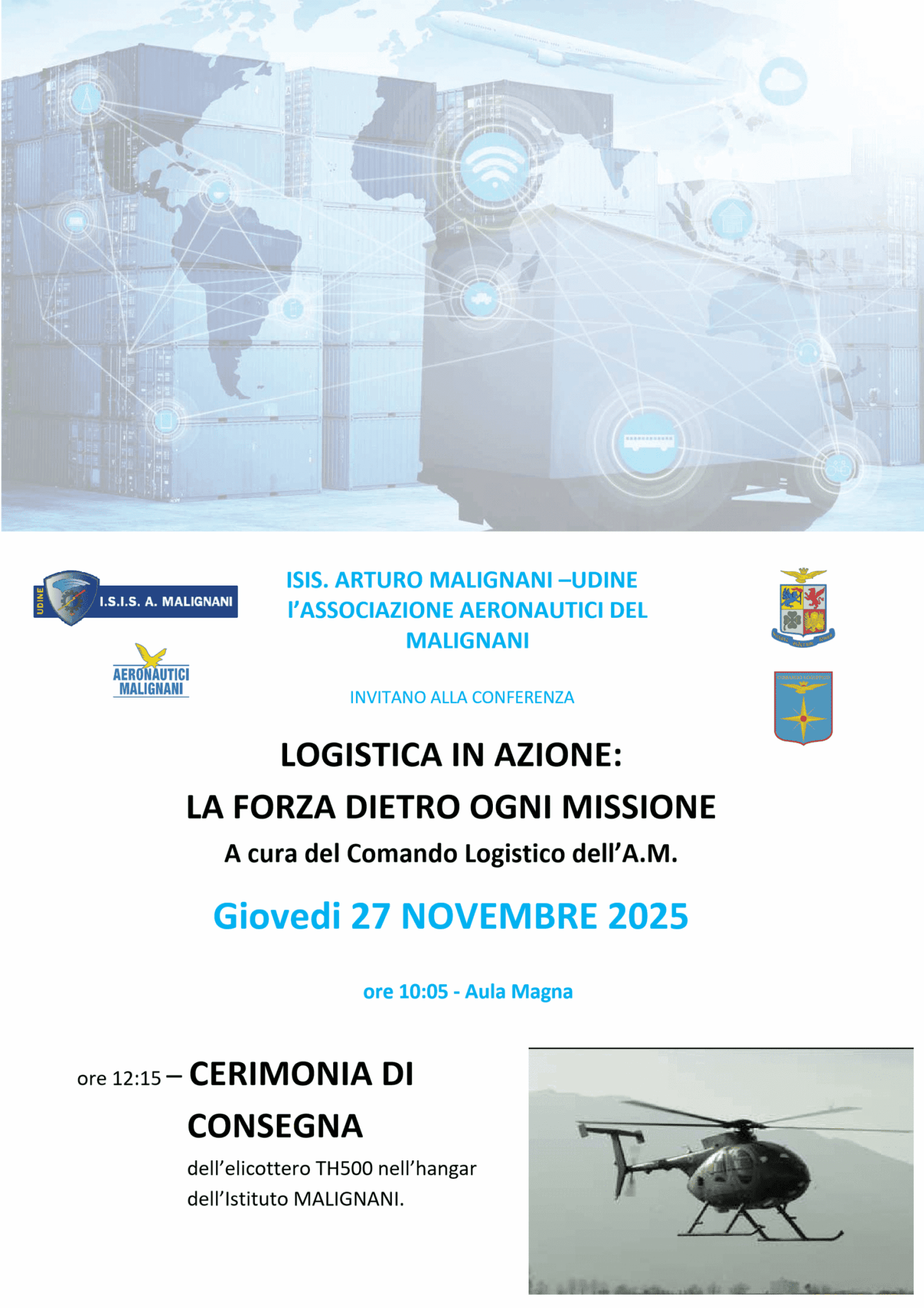 La conferenza, che si terrà nell’Aula Magna dell’Istituto, avrà inizio alle 10.05 avrà come relatori il Gen. S.A. Achille CAZZANIGA e il Brig. Gen. Massimo CICERONE del Comando Logistico dell’Aeronautica Militare.