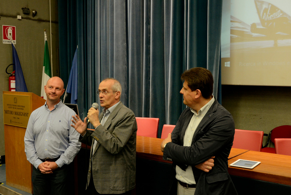 Foto: l’articolo del “Messaggero Veneto” ; la visita di Pecile al Malignani, col Preside Carletti ed il prof. Fasano.